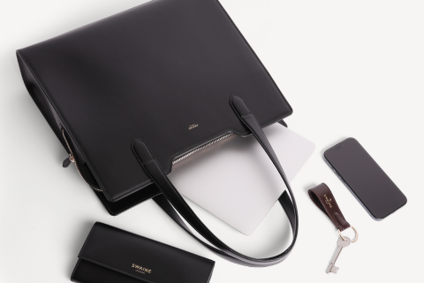 The Swaine tote bag fits a standard laptop with ease, offering a timeless companion of refined understatement.